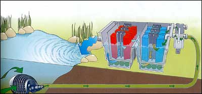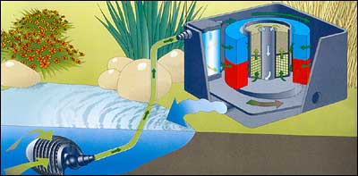 Vijverfilters hebben een pomp nodig, ofwel om het water aan te zuigen, ofwel om het door de filter te stuwen. Het water wordt, naarmate het door de filter loopt, behandeld door steeds kleiner wordende filtermedia, waardoor steeds kleinere deeltjes vuil uit het water gefilterd worden. Plaats nooit een fijn filtermateriaal voorin de filter omdat het systeem dan snel verstopt en voortdurend nageken moet worden.