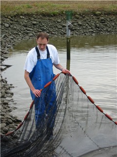 De mudpond wordt afgevangen door met een sleepnet langs de kanten van de mudpond de koi naar het midden te jagen. Daar komen ze in het net dat dan naar de oever aan de overzijde wordt gesleept. Als de koi zijn bijeen gedreven worden ze in een bowl geplaatst en naar de truck gebracht. Het aantal afgevangen vissen wordt nauwgezet geteld. We hadden het heel goed gedaan want op deze pond zaten 250 koi en we hadden er bij onze eerste sleep 237. Er moest dus een tweede keer gesleept worden om de overige 13 te vangen. Op de onderste foto is onze koi-oogst te bewonderen. Vooral Gosanke tussen 25 en 40cm maar er zijn ook koi van alle andere variëteiten aanwezig.